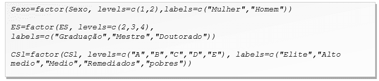 No primeiro exemplo, para calcular as diferentes medidas propostas no quadro anterior, construímos, principalmente, as variáveis no script de R-project e consecutivamente, converter o objeto vetorial em objeto fator, que é a maneira como R armazena os variáveis categóricos.