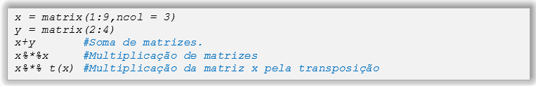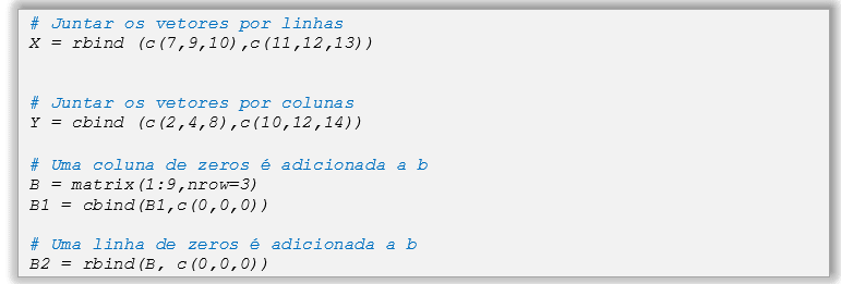 A função concatenar c() é utilizada na criação de uma matriz, bem como as funções rbind(), cbind() como é ilustrado a seguir: