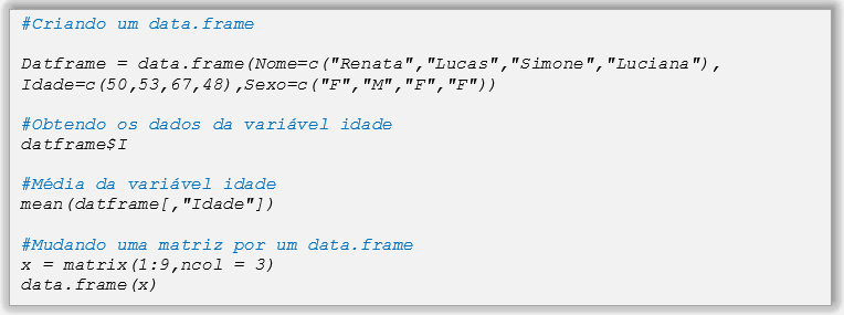 A função data.frame() permite criar ou salvar tabelas de dados, criando uma estrutura onde as linhas são do mesmo elemento e as colunas podem ser de diferentes tipos. Em um data.frame() as linhas e colunas devem ter o mesmo tamanho (da mesma forma que em uma matriz), sendo esta estrutura de dados a generalizacão do objeto matriz. Além disso, esse tipo de objeto é fundamental na maioria dos pacotes do software R.