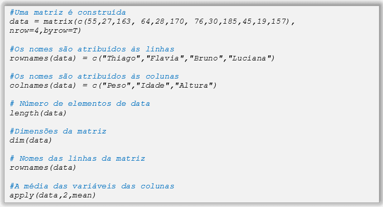 A atribuição de nomes as colunas é realizada mediante a função colnames (). A atribuição de nomes para as linhas é mediante a função rownames (). A seguir, serão mostradas algumas funções das matrizes: