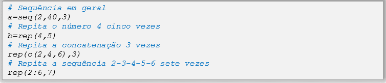 A função seq (início, final, passo) e rep (vetor, # de veces) gera sequências de valores.