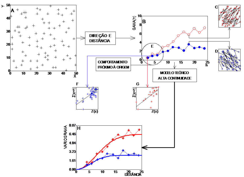 A função variograma depende apenas de dois parâmetros: distância e direção (Figura 1). Cada ponto do variograma representa uma correlação de Z(x+h) contra Z(x) (Figuras 1F e 1G). No exemplo dessa figura, as duas direções principais são 45 e 135o, como se pode verificar nos vetores formados pelos pares de pontos (Figuras 1C e 1D). A partir dos variogramas experimentais (Figura 1B), ajusta-se o modelo teórico que descreve a correlação espacial (Figura 1H). Deve-se ressaltar que a distribuição dos pontos de dados (Figura 1A) tem um papel importante no cálculo de variogramas experimentais.