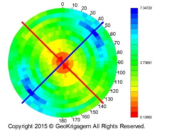 No caso de dados geológicos, a orientação geológica regional ou local fornece as direções principais para o cálculo dos variogramas experimentais. Entretanto, quando não se tem essa informação a priori, pode-se calcular o mapa variograma que fornece as direções principais do fenômeno espacial em estudo.