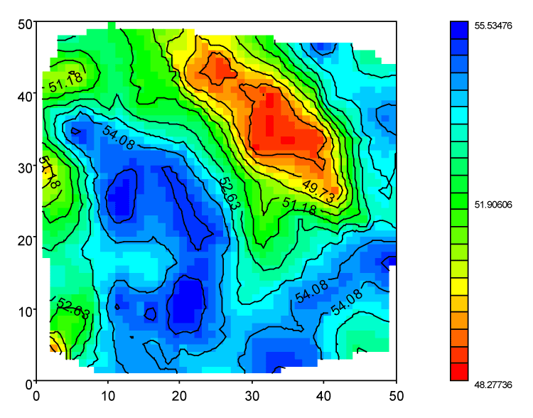 Na Figura 6, ilustra-se o desvio padrão de krigagem que é a raiz quadrada da variância de krigagem.