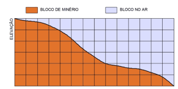 Figura 2: Seção mostrando separação de blocos no ar e no minério, conforme a topografia do terreno.