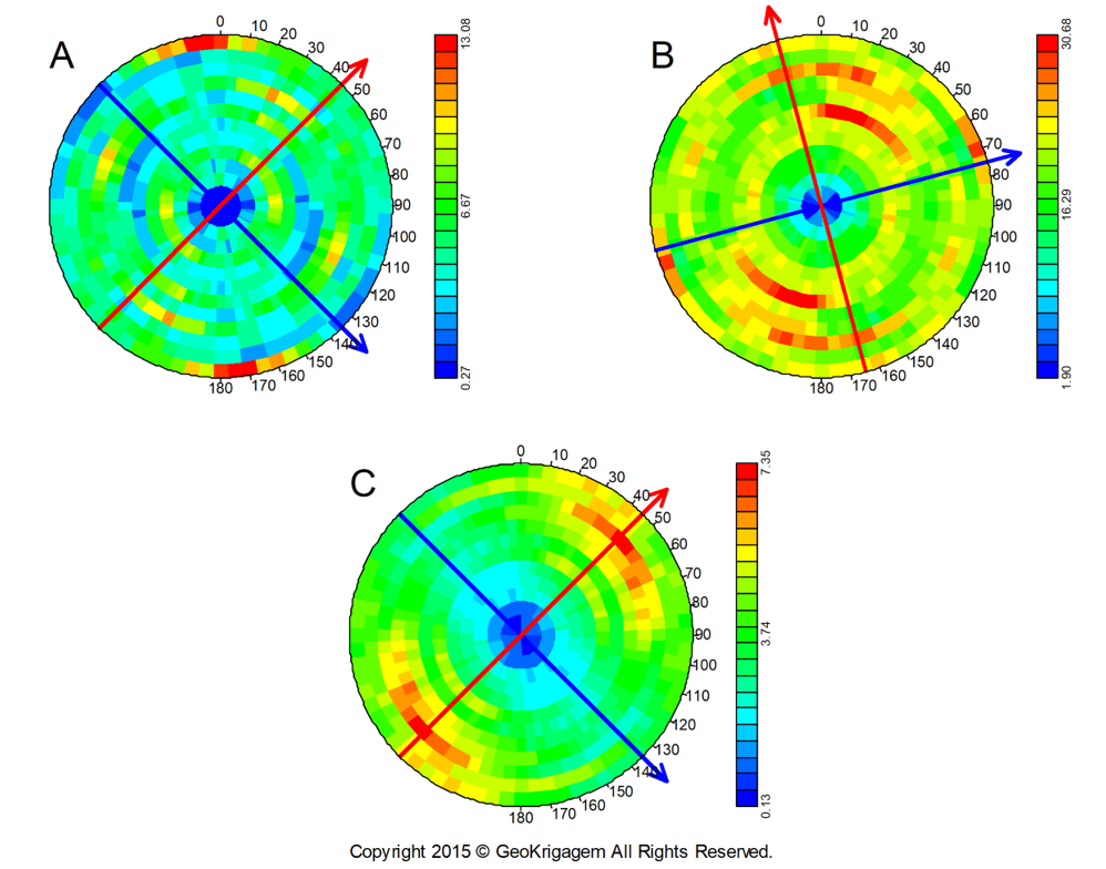 A obtenção do mapa variograma se dá pelo cálculo de todos os variogramas de 0 a 180 graus, em intervalos angulares predefinidos. Geralmente, um intervalo predefinido de 5 graus já é uma boa aproximação. Feito isso, o próximo passo é a representação de cada variograma direcional no mapa circular (Figura 1), onde os valores da função variograma são plotados conforme a escala de cores. As distâncias são projetadas a partir do centro (distância zero) para a borda da circunferência (distância máxima).