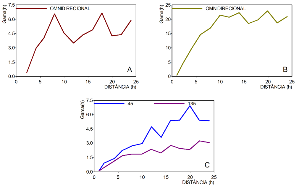 Para aqueles conjuntos em que não há anisotropia, procede-se ao cálculo do variograma omnidirecional (Figuras 3A e 3B). Caso contrário, calcula-se os variogramas direcionais nos eixos de anisotropia (Figura 2C). Os variogramas da Figura 3 foram calculados com os parâmetros da Tabela 1.