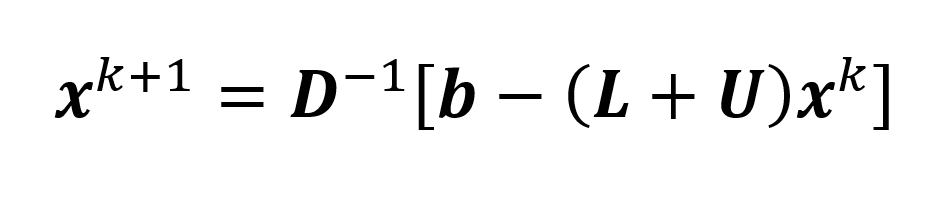 Onde D é a matriz diagonal, L é matriz triangular inferior e U a matriz triangular superior, decomposta a partir da matriz dos coeficientes A.