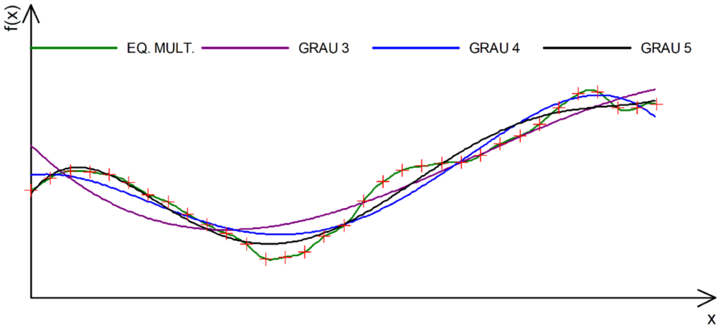 Como se pode observar nesta figura, as equações multiquádricas proporcionam uma interpolação exata, enquanto os polinômios se ajustam conforme a tendência, mas não passam exatamente pelos pontos de dados.