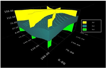 Em muitos casos, os domínios mineralizados coincidem com as unidades geológicas (minério de ferro, metais base sedimentares ou depósitos de sulfetos de metais base) e, dessa forma, a modelagem de teores é restrita inteiramente pela geologia (Glacken e Snowden, 2001, p. 190). Por exemplo, a Figura 1 ilustra uma camada mineralizada (Lito 2), que deve ser avaliada quanto ao seu potencial mineral.