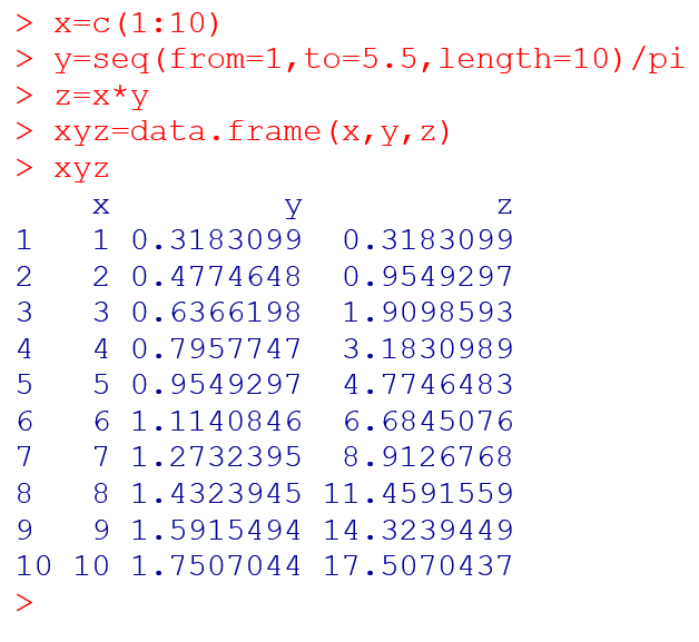 Trata-se do tipo de objeto de grande uso na linguagem R. Assim, torna-se importante destacar como se pode gerar um “data frame” a partir de vetores de comprimentos iguais. No exemplo a seguir, tem-se três vetores x, y e z criados com tamanhos iguais a 10, sendo x uma sequência de valores de 1 a 10, y uma sequência variando de 1 até 5.5, mas divididos por π e z o vetor que é o produto de x por y.