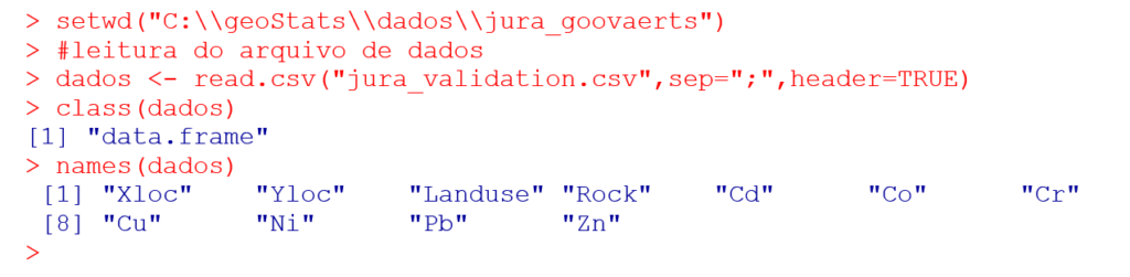 O script anterior mostrou como se pode gerar um data frame a partir de três vetores numéricos de comprimentos iguais. Um exemplo mais completo pode ser mostrado a partir da leitura de um arquivo de dados denominado Jura (Goovaerts, 1997, p. 4-6).