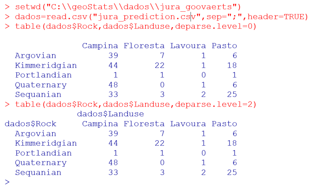 Aplicando-se a função table() para as variáveis dados$Rock e dados$Landuse, tem-se os resultados apresentados a seguir.