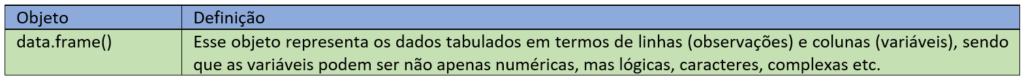 Na linguagem R, o data frame pode ser idealizado como uma matriz com n linhas (observações) por m colunas (variáveis) com a diferença que as colunas podem conter não apenas valores numéricos, mas também caracteres, números complexos e variáveis lógicas (Tabela 8).