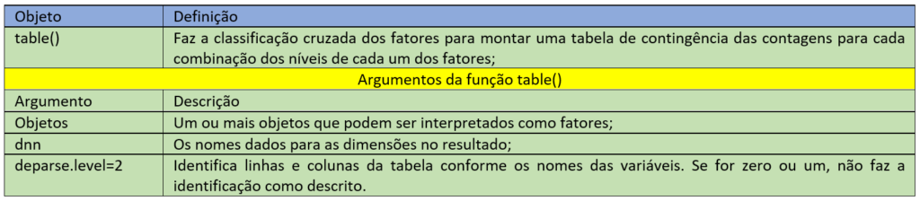 Antes de prosseguir, seria interessante introduzir a função table(), de acordo com a descrição na Tabela 9.