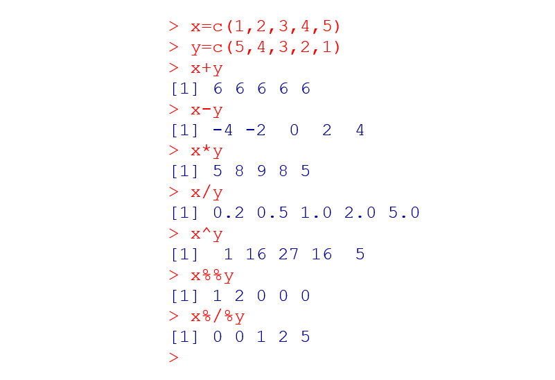 A aplicação dos operadores aritméticos e relacionais pode ser feita sobre dois vetores de comprimentos iguais ou diferentes, desde que o tamanho do maior vetor seja um múltiplo do menor. Os exemplos seguintes ilustram estas situações, sempre fazendo o vetor y duas vezes o vetor x. Aplicando-se os operadores aritméticos: