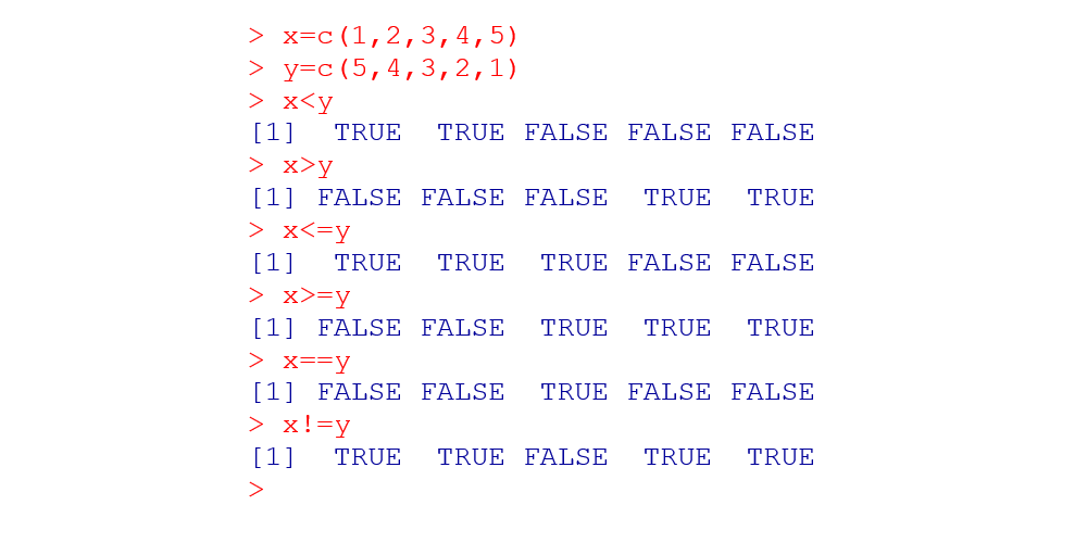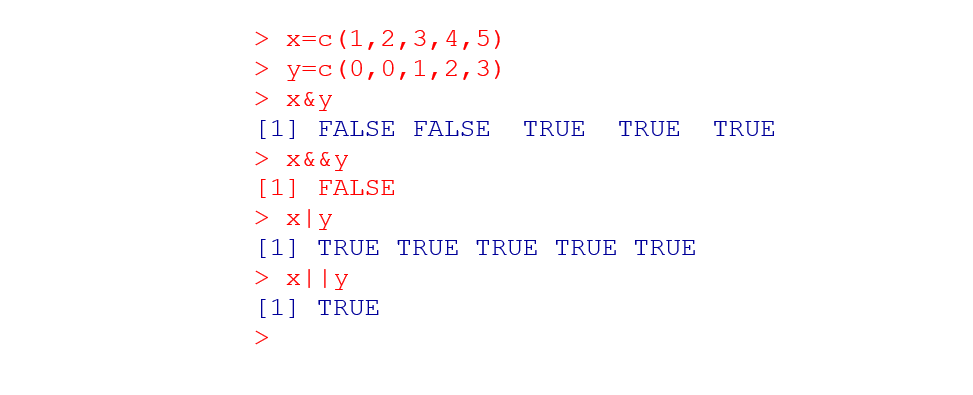 A aplicação dos operadores lógicos retorna sempre um valor booleano: TRUE ou FALSE. No exemplo a seguir, tem-se dois vetores numéricos x e y, aos quais se aplicam os operadores lógicos.