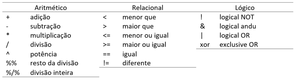 Na linguagem R, assim como em outras linguagens de programação, há os operadores, que podem ser classificados em: aritméticos, relacionais (comparações) e lógicos (Paradis, 2005, p. 25), conforme a Tabela 11.