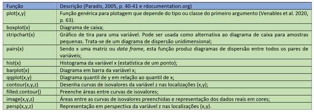 Neste item, expõe-se as funções gráficas disponíveis no R e que permitem a construção dos mais variados tipos de gráficos. Existem dois tipos de funções gráficas: alto nível que cria um gráfico; baixo nível que adiciona feições a um gráfico previamente criado (Paradis, 2005, p. 36).