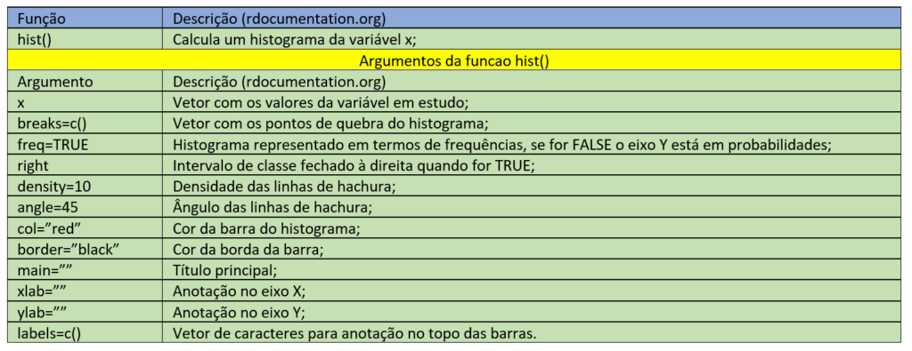 O histograma é uma representação gráfica da estatística de um ponto. Os valores da variável são selecionados em intervalos de classes e apresentados na forma de um histograma, com as barras verticais proporcionais à frequência em função das classes. Não é possível obter múltiplos histogramas, como se demonstrou com as funções boxplot() e stripchart(). Entretanto, é possível gerar vários histogramas compartilhando o mesmo dispositivo gráfico. A função hist() e seus argumentos estão na Tabela P25.1.