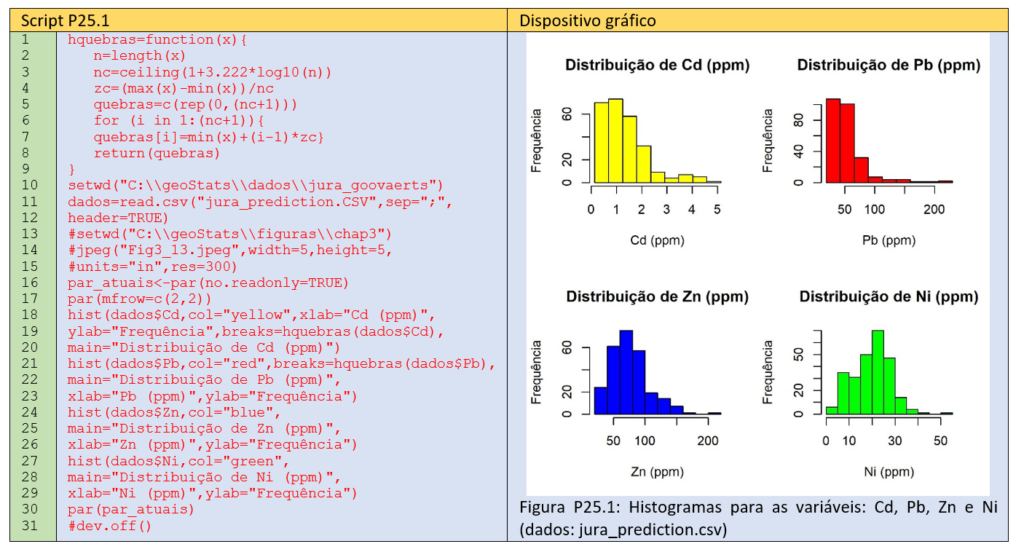 Neste item, a função hist() é aplicada com os argumentos default (Script P25.1), representando as distribuições de Cd, Pb, Zn e Ni, derivadas do conjunto de dados jura_prediction.CSV (Goovaerts, 1997, p. 4-6). O Script 3.13, que gera a Figura 3.13, usa uma função que calcula as quebras do histograma hquebras(), pois no sistema gráfico tradicional a função hist() só permite alterar o número de classes através do vetor com os pontos de quebra do histograma.