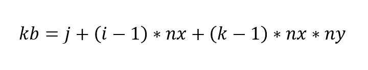 Onde: kb é o número do bloco, nx é o número de colunas, ny o número de linhas da matriz bidimensional, i é a variável correspondente ao eixo Y, j é a mesma no eixo X e k é a variável que se move na vertical (níveis no plano vertical).