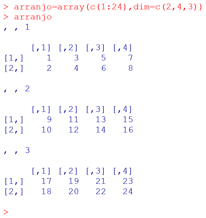 No exemplo a seguir, gera-se 24 números inteiros que são arranjados em três matrizes de 2 linhas por 4 colunas, como se pode verificar no console. Os valores estão organizados por colunas: