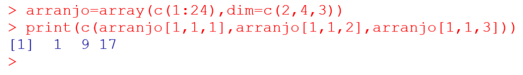 Para acessar um determinado elemento na estrutura de “array”, deve-se especificar os índices i, j e k. Sendo que i representa a linha, j a coluna e k a matriz. Veja os exemplos a seguir: