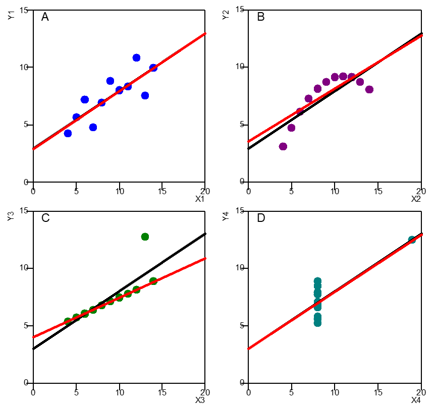 A regressão do conjunto (Y2 por X2) apresenta resultados ligeiramente diferentes entre os dois métodos. Os dados do quarteto de Anscombe (1973) têm sido usados para demonstrar a importância dos gráficos em estatística. Por exemplo, na Figura 2B os pontos descrevem uma parábola e, portanto, a reta não seria a melhor escolha para definir a relação entre as variáveis Y2 e X2. Por outro lado, a regressão para os conjuntos de pontos da Figura 2D foi definida por apenas um ponto, como foi ressaltado por Anscombe (1973, p. 19).