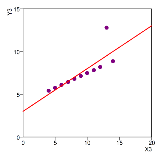 A regressão dos mínimos quadrados pode ser influenciada pela existência de um ou mais pontos anômalos, por diversas razões, como, por exemplo, erro na digitação dos dados. Para ilustrar uma situação em que isso ocorre, seja a reta de regressão dos mínimos quadrados ajustada sobre os dados (Y3 por X3) do quarteto de Anscombe (1973, p. 19).