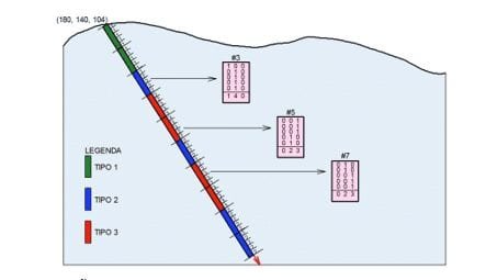 Para esse exemplo foi escolhido um intervalo de 5 m. A Figura 1 representa o furo inclinado com suas litologias, bem como o resultado da regularização para três intervalos escolhidos (#3, #5 e #7). Considere-se o furo nas coordenadas (180, 140 e 104), com azimute 130º e inclinação de 57,529º.