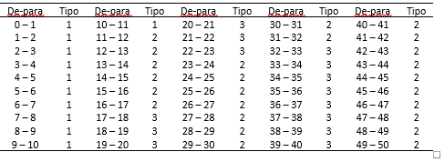 Considere-se um trecho composto por n intervalos de-para, para o qual se deseja saber o tipo mais frequente. Assim, calcula-se a frequência para o k-ésimo tipo: