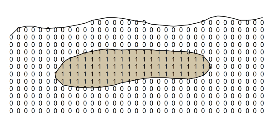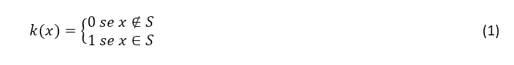 No primeiro capítulo, o autor exemplifica um fenômeno de transição, como aquele que pode ou não apresentar uma característica, como, por exemplo, uma formação geológica S de extensão limitada, em que uma sondagem pode ou não perfurá-la. Essa situação pode ser expressa pela função indicadora de S, como (Matheron, 1971, p. 9):