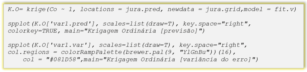 Usando os argumentos locations = jura.pred, newdata = jura.grid,model = fit.v , a krigagem ordinária é criada. A função spplot será usada para projetar o gráfico da predição e a variância do erro da K.O.